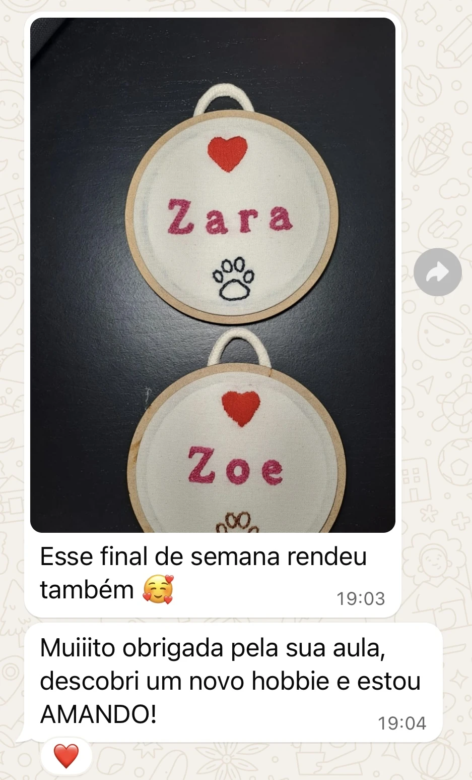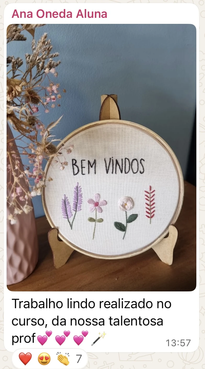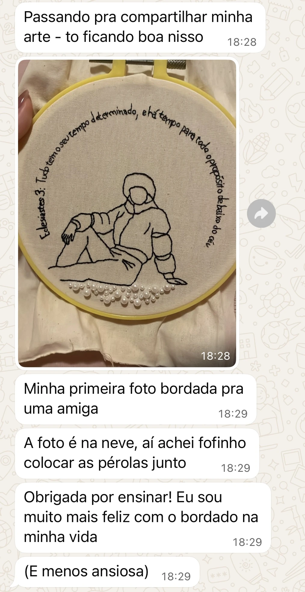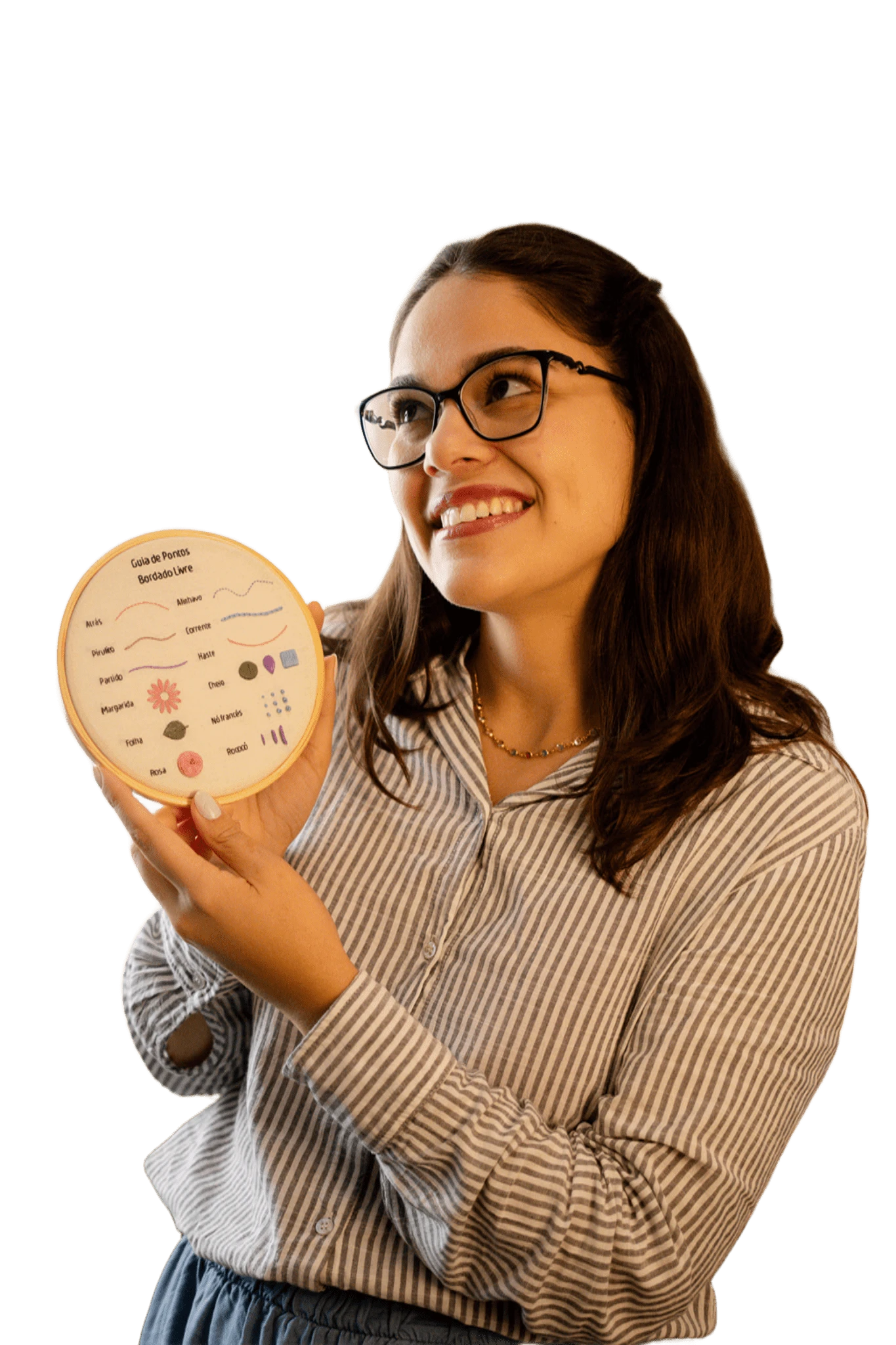 Já ensinei muitas mulheres a bordar e a ter esse momento de autocuidado com uma atividade manual. Hoje, você, de qualquer lugar do mundo, poderá se tornar uma fiel bordadeira. Vamos juntas espalhar o feito à mão pelo mundo?