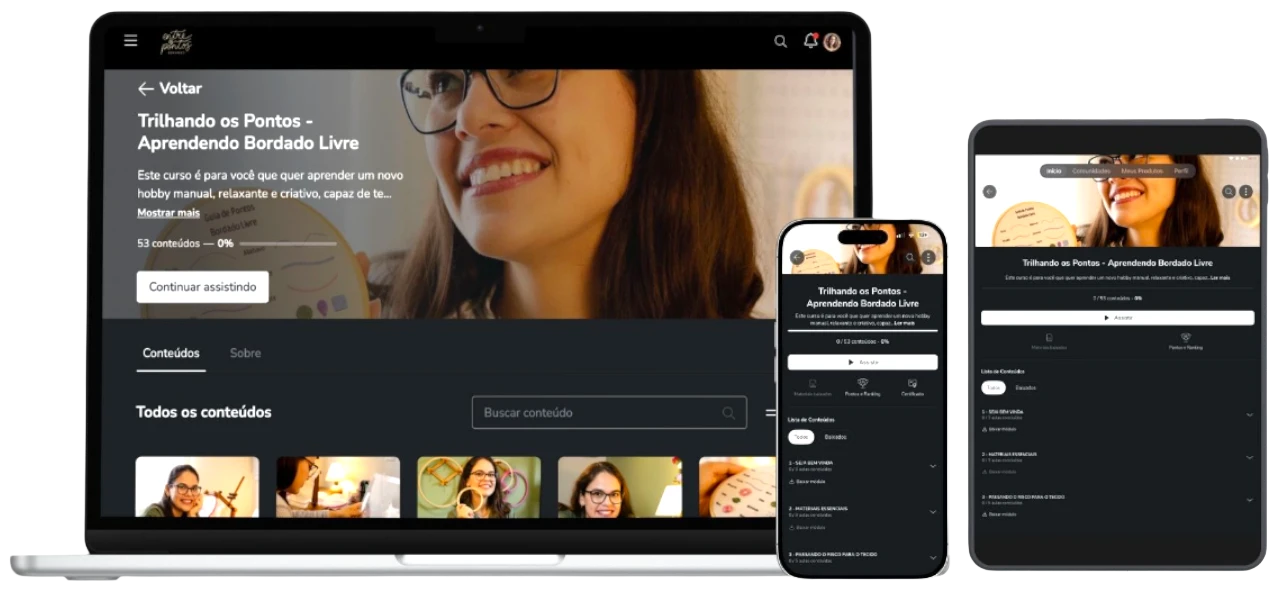 Todo o conteúdo do curso é dividido e organizado por módulos que contam com aulas gravadas e materiais complementares para você aprender a bordar mesmo partindo do mais absoluto zero.